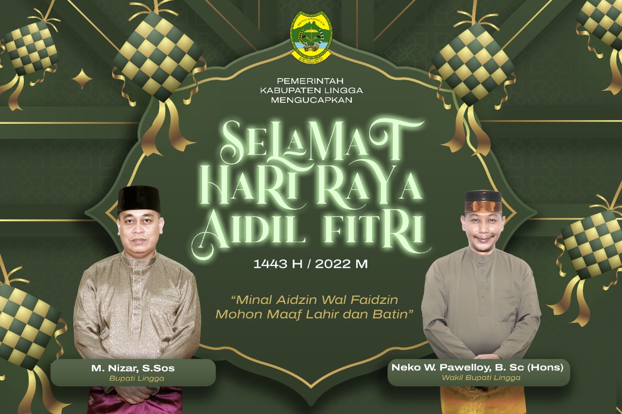 Banner Ucapat Selamat Hary Raya Idulfitri 1443 H. 2022 M. yang di media Leadernusantara.com oleh pemerintah kabupaten Lingga selama 10 Hari, mulai dari Tgl 30 April s/d 09 Mei 2022.