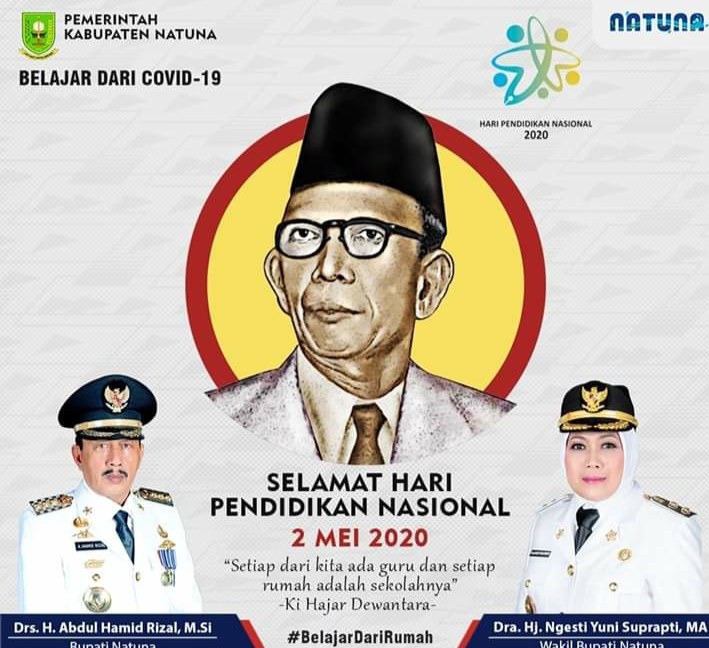 Natuna, leadernusantara.com-Meskipun dalam suasana pandemi Corona/COVID-19 Bupati dan Wakil Bupatij Natuna Drs Hamid Rizal, M.Si dan Drs.Hj. Ngesti Yuni Suprapti, MA., Tetap mengucapkan “Selamat Hari Pendidikan Nasonal” yang selalu diperingati di setiap tanggal 2 Mai di seluruh Indonesia.