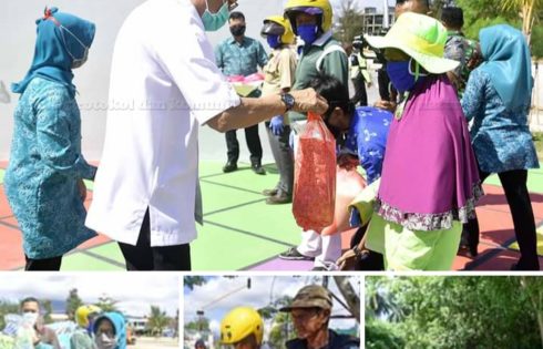 Saat penyaluran bantuan, Kamis, (09/04)Bupati Natuna Drs. Hamid Rizal, dan Ketua Tim Penggerak (TP) PKK Kabupaten Natuna Ny. Nurhayati Hamid Rizal, juga didampingi oleh beberapa pimpinan Organisasi Perangkat Daerah, (OPD) di lingkungan Pemda Natuna, Perwakilan dari TNI/Polri, penerima bantuan tukang ojek dan petugas harian taman.