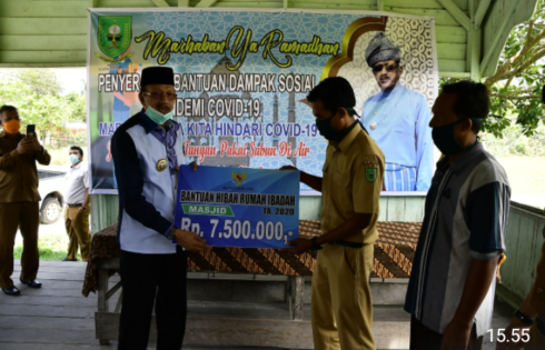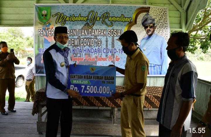 Selain membagikan paket sembako dari bantuan CSR Bank BPD Riau Kepri dan BP Migas Bupati juga menyerahkan dana bantuan rumah ibadah sebesar Rp 7.500.000,- untuk masjid dan Rp 5000.000 untuk surau.