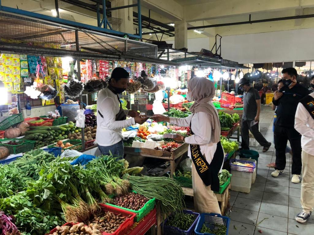 Duta humas Polda Kepri turun kepasar-pasar memberikan selebaran kepada para pedagang untuk mematuhi protokol kesehatan