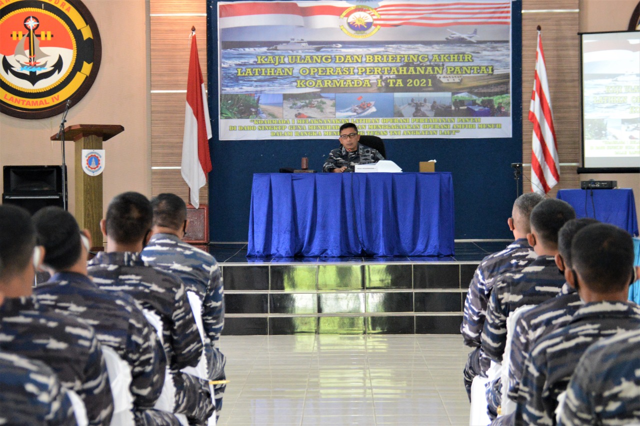 Tanjung Uban (Leadernusantara.com) – Komandan Pangkalan Utama TNI Angkatan Laut IV (Danlantamal IV)  Tanjungpinang Laksamana Pertama TNI Indarto Budiarto, S.E., M.Han., hadiri acara Kaji Ulang dan Briefing Akhir Latihan Operasi Pertahanan Pantai (Latopshantai) Koarmada 1 TA 2021 di Gedung Serba Guna Fasharkan Mentigi, Tanjung Uban, Kepulauan Riau, Jumat pagi (16/4/2021).