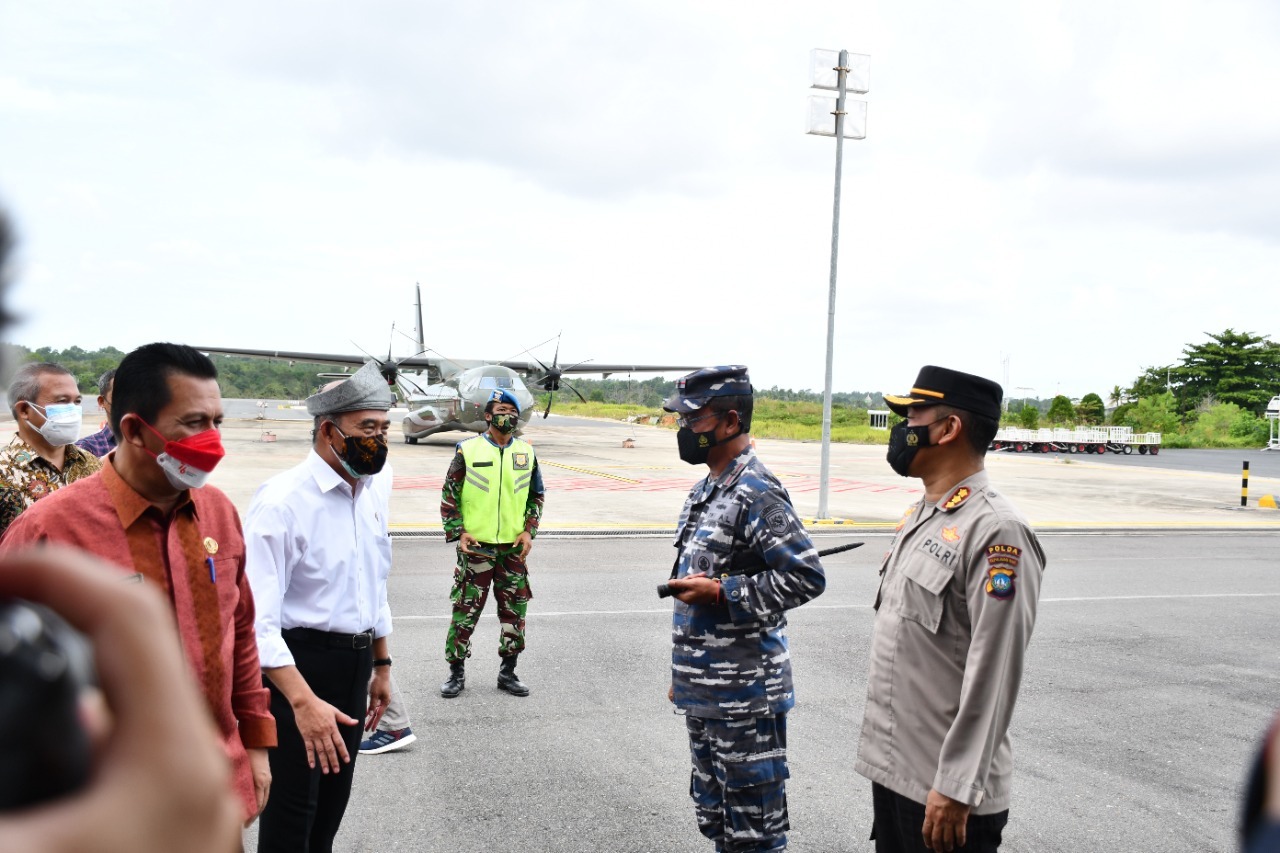 Tanjungpinang (Leadernusantara.com) – Komandan Pangkalan Utama TNI Angkatan Laut IV Tanjungpinang (Danlantamal IV Tanjungpinang) Laksamana Pertama TNI Indarto Budiarto, S.E., M.Han., bersama Gubernur Provinsi Kepri H.Ansar Ahamad, S.E., M.M.,  sambut kedatangan Menteri Koordinator Bidang Pembangunan Manusia dan Budaya RI (Menko PMK RI) Muhadjir Effendy di Bandara Raja Haji Fisabilillah (RHF) Tanjungpinang Kepri, Kamis siang  12 Agustus 2021.
