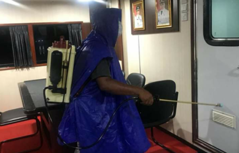 Tidak cukup lulus Rapid tes, MV. Indra Perkasa juga dilakukan sterilisasi dengan penyemprotan desinfektan.