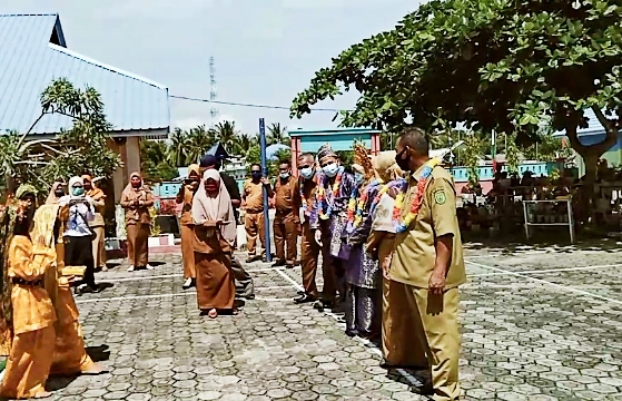 serta kalungan bunga yang di kalungkan langsung oleh Kepala Sekolah Zuriati, S.Pd.,MM. didampingi oleh para Guru dan TU di Sekolah tersebut.