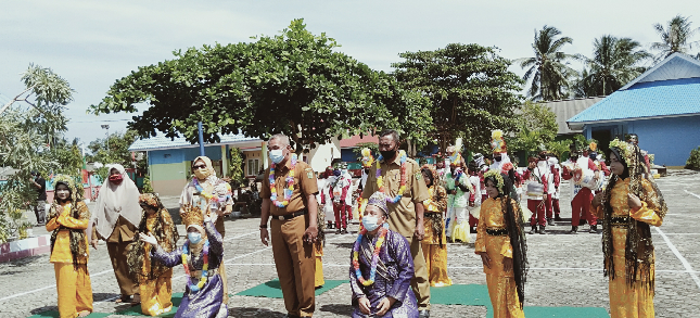 Rombongan yang tiba pada Pukul 09.40 WIB pagi itu, dengan menerapkan standar protokol kesehatan COVID-19, di sambut meriah dengan kesenian Dram Bek, Tarian Persembahan oleh Siswa dan siswi SDN 005 Sepempang binaan Baharudin. S.Pd.I,