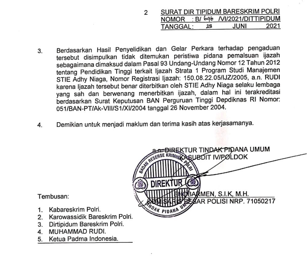 “Nggak benar itu, Jangan bapak beritakan, ya, nanti Panjang Ceritanya”, kata Horjani menjawab media ini. Saat ditanyakan kembali kenapa tidak boleh diberitakan, malah Horjani mengirimkan foto surat yang berlogo Bareskrim Polri, bertulisan pemberhentian Pemeriksaan kasus ijazah yang diduga Palsu, melalui pesan Whatsapp henphon selulernya kepada whatsapp awak media ini. ( Taherman)