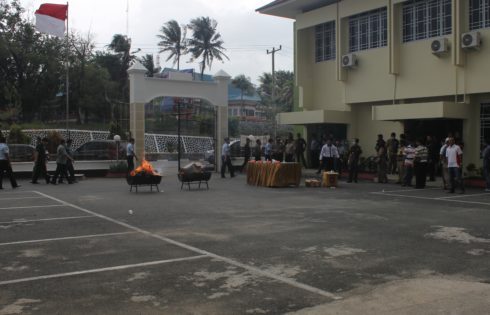 “Adapun barang bukti yang di musnahkan berupa sabu dan ganja seberat 1,402 gram dengan alat isap (Bong) serta 123 jenis kosmetik berbagai merk yang di sita dari tahun 2016, hingga 2017 yang telah Inkracht,” katanya Supardi.