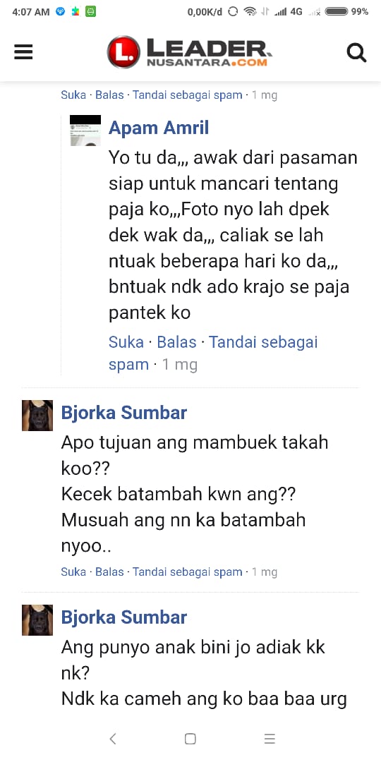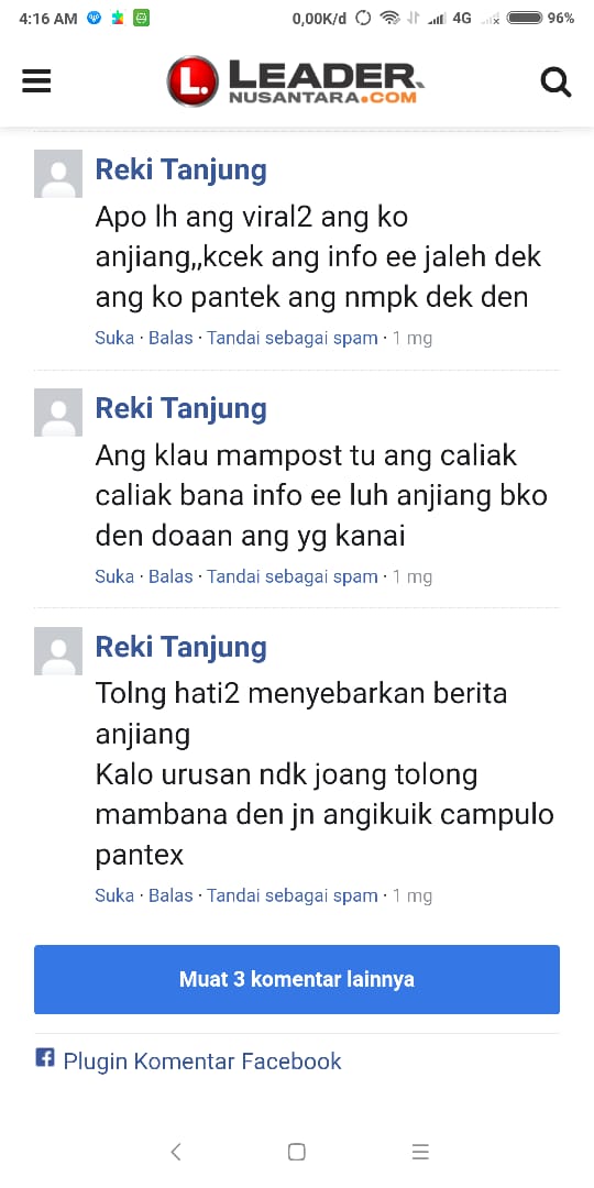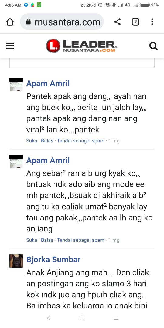 Seperti yang mengatasnmakan di kolom komentar media ini, Apam Amril, Bjorka Sumbar, Reki Tanjung, yangmenuliskan kata-kata caci makian, diduga terkait pemeberitaan salah satu pimpinan Pasantren IMAM.GHAZALI, diduga melakukan pelecehan seksual terhadap santarinya yang sedang menimba ilmu agama di pasantren tersebut.