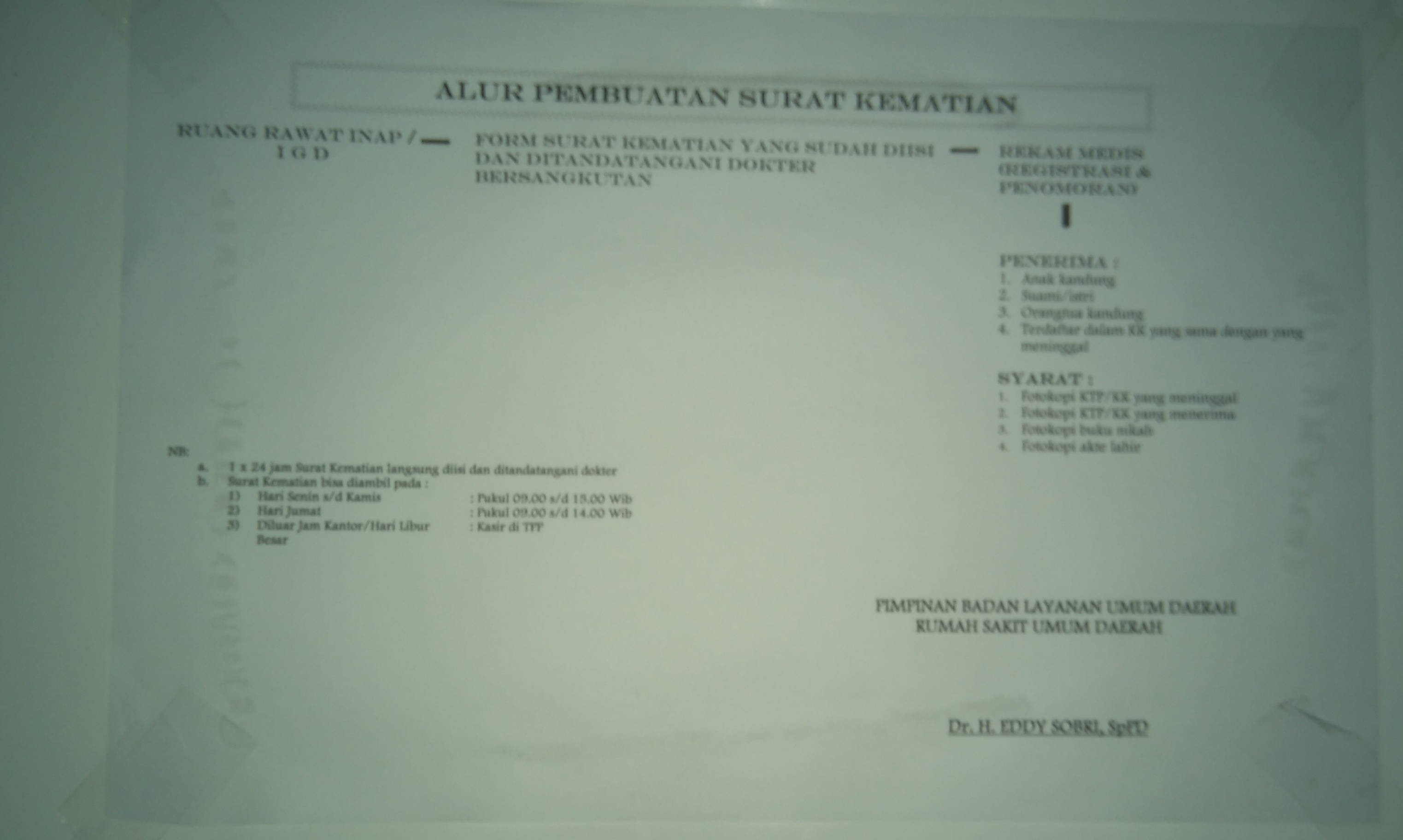 Maka keluar dr. Widia mengatakan, “isyarat mengajukan surat keterangan kematian, harus ada Foto copy KTP, Akte Nikah dan KK, yang ada tercantum nama yang meninggal didalam KK tersebut. Boleh diambil, oleh anak, Suami, istri dan keluarga Almarhum, asalkan ada surat-menyurat seperti yang disebutkan tadi,” jelas Widia.