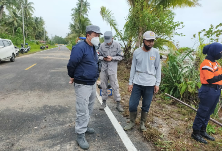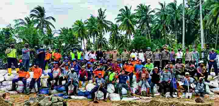 Semua pihak yang hadir, nampak bersama-besama melakukan perbaikan bibir pantai yang rusak oleh gelombang air laut.