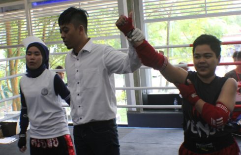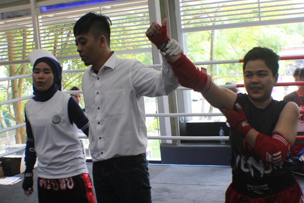 Peserta wanita dari Camp AS DOJO Tanjungpinang Desi Natalia posisi sebelah kiri menang Komfetisi Muaythai Indonesia Kepri 2018 di Batam