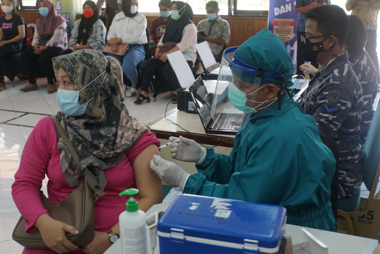 Dilokasi kegiatan para vaksinator di awasi langsung oleh Kadiskes Lantamal II Letkol Laut (K) Zulfitri.S.Si. M.Kes., sebagai penanggungjawab kegiatan. Sumber Dispen Lantamal II. (Leader)
