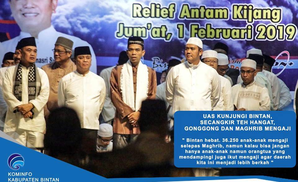 Tabligh Akbar UAS bersama masyarakat Bintan di Lapangan Relief Antam Kijang, Kecamatan Bintan Timur, Kijang, Jum’at malam (1/2), meninggalkan kesan menarik, dalam tausiah yang diampaikan UAS, dapat dinikmati ribuan masyarakat tumpah memadati seluruh sisi lapangan.